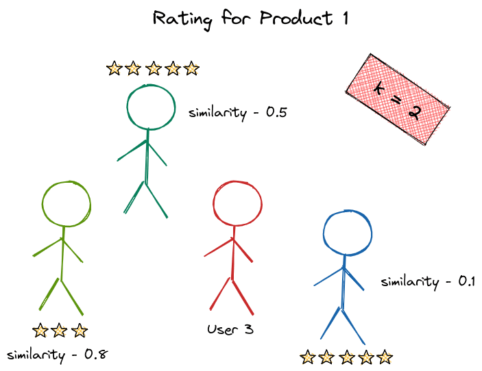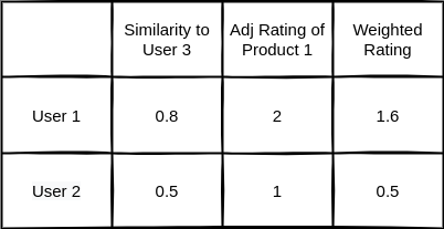 For example, the similarity of user 1 and user 3 is 0.8. The rating of user 1 for product 1 is 2. We multiply the adjusting rating of user 1 by their similarity of 0.8.