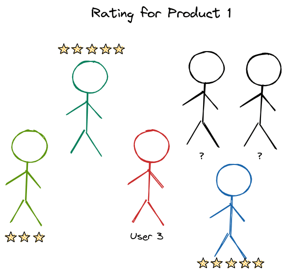 Imagine we want to predict the rating of user 3 for product 1 based on the ratings of other users. We first want to select only the users who have rated product 1.