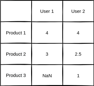 In the GIF below, since the mean rating of user 1 for all products is 1, we subtract the rating of user 1 for product 1 by 1. Since the mean rating of user 2 for all products is 4, we subtract the rating of user 2 for product 1 by 4.